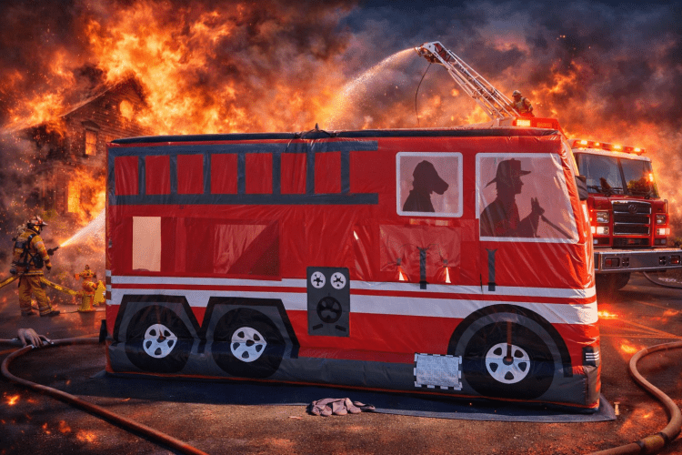 Kids can make believe they are a brave Fire Fighter and race to the rescue. The Firetruck includes a jumping area, a mini slide, a tunnel, and pencil shaped obstacle pillars! You enter over the front tire and are immediately greeted by the colorful obstacle pillers. Plenty of jumping room for the little ones too. Then they can head to the ladder climb to the top of the slide and down to the back of the truckwhere they can either exit at the opening at the back wheel or choose to stay inside and head back to the front.The kids can look out the window screens to wave to mom and dad. And there are plenty of screens all around for the parents to keep a close eye on their kids.