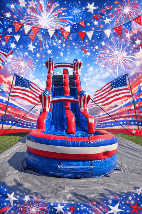 You'll have a blast with this monster!  The ladder provides the climb to the top (hand hold straps run the length of the ladder for a safer climb) and then you can slide down to land in a splash in the pool.  The top of the slide is netted for safety.  Show off your American pride and rent this slide with its red, white, and blue theme.