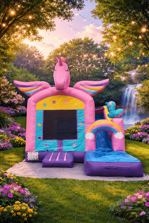 Every little girl LOVES Unicorns! Make her party special with this fancy Unicorn combo bounce and slide. The ladder to the slide starts at the back wall and goes up to the right side of the unit. When they come down the slide, the landing area can be used with a pool attachment (shown) or a "stopper" attachment. The glitter built into the vinyl really make this bounce sparkle in the sun!